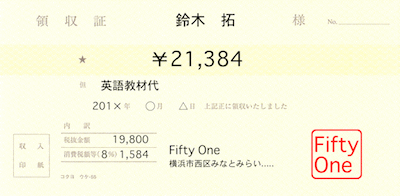 領収書の例は以下になります。(他の但し書き、他の組み合わせも可能です)